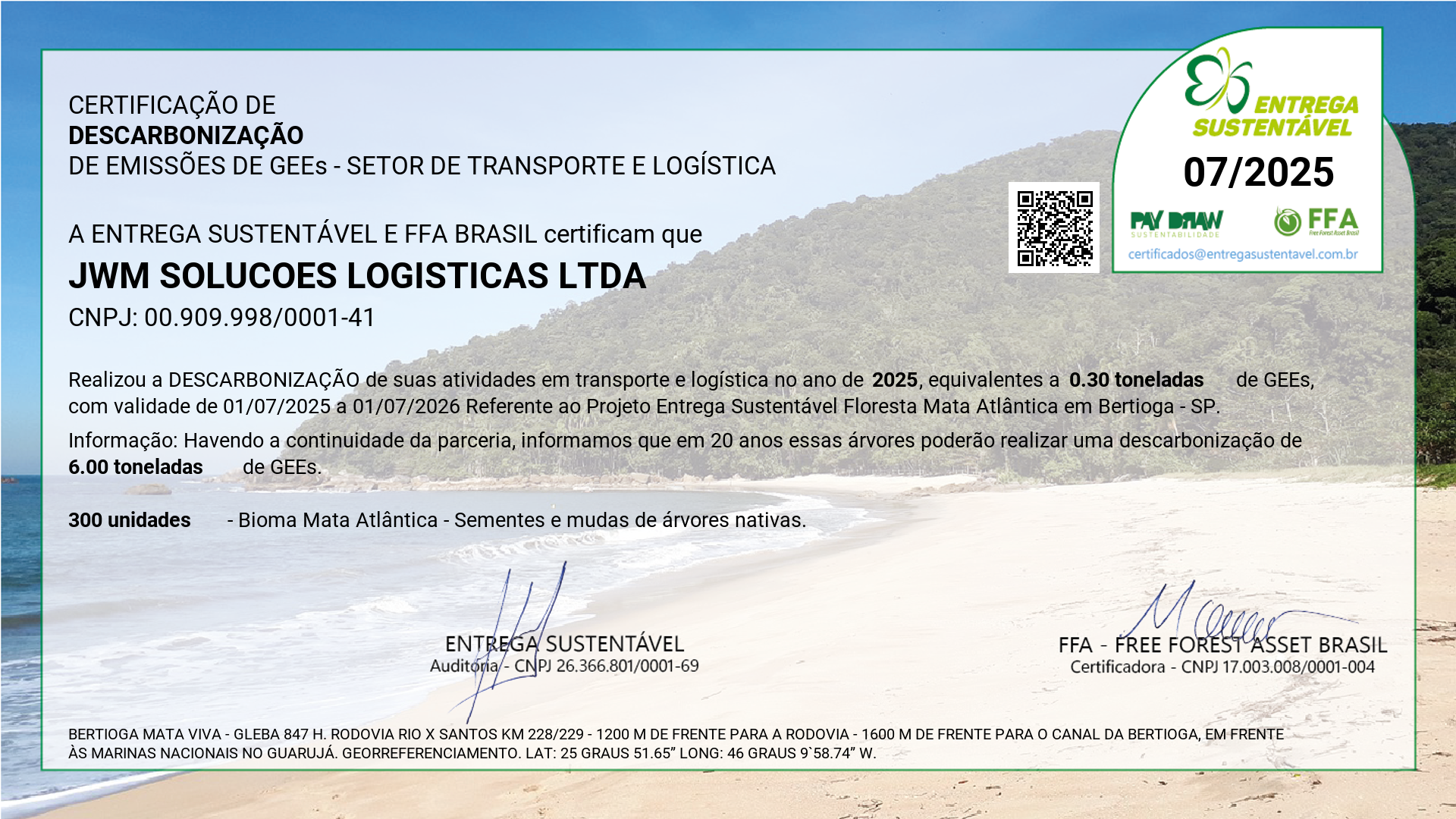A Entrega Sustentável, em parceria com a FFA Brasil, preserva uma reserva de Mata Atlântica às margens da Rodovia BR-101, garantindo descarbonização real, sem riscos de greenwashing. As empresas participantes recebem o Selo Verde Entrega Sustentável, fortalecendo sua imagem com transparência e respaldo técnico.